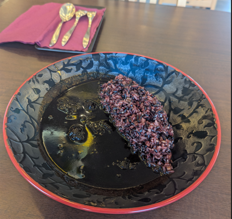 牛肉がスプーンでほどける柔らかさでおいしい。ご飯が十六穀米でコリコリ食感が面白い。竹炭入りでデトックス効果高そう。