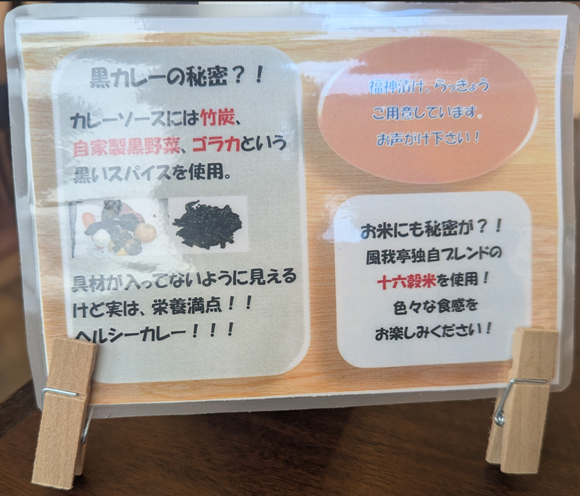 黑カレーに舌鼓を打ちつつ、ふと、テーブルの隅を見れば、「福神漬け、らっきょご用意しています。お声がけ下さい。」との表記が・・・