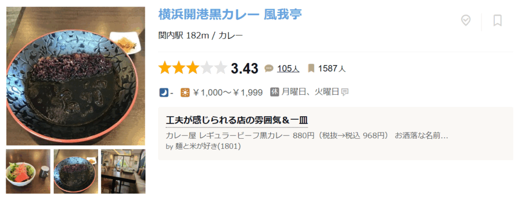 「風我亭横浜開港黒カレー」、美味しいと思います。当然、お好みがあるので、全ての人に合うとは言えませんが、コクのあるルーと箸で切り分けることげできる柔らかく煮込んだ牛肉は中々のお味だと思います。「食べログ評価3.43」の価値はあるのではないでしょうか。ただ、セットで付いている十六穀米については、ヘルシーさを求める人は別として、白米好きの方には、賛否両論あるかもしてないなとは思いました。